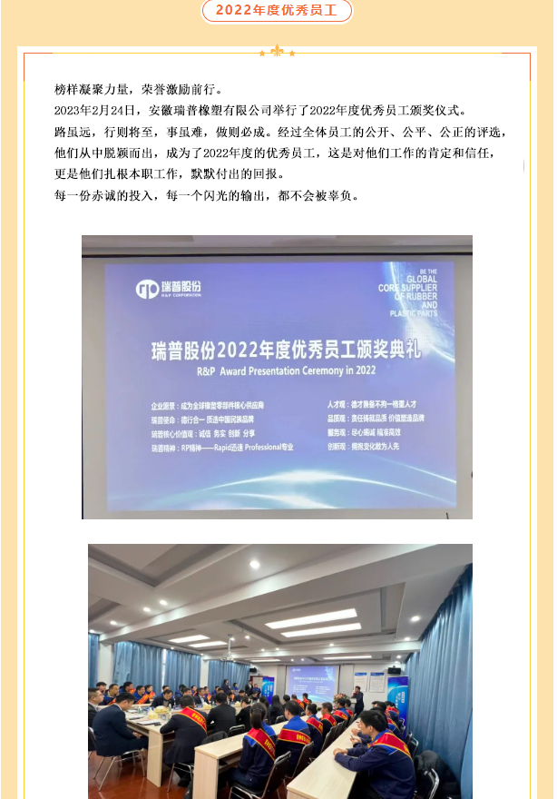 董事長(zhǎng)對(duì)各部門(mén)、子公司負(fù)責(zé)人的2022年度總結(jié)及2023年度工作規(guī)劃進(jìn)行分析,對(duì)大家疫情期間的工作予以肯定,并對(duì)其薄弱與不足之處提出改進(jìn)意見(jiàn)。2023年公司將圍繞開(kāi)拓新市場(chǎng)、項(xiàng)目管理制度、事業(yè)部智能化制造、員工工作能力、公司管理制度等方面進(jìn)行提升。努力為員工提供更好的福利待遇,為客戶提供更優(yōu)質(zhì)的服務(wù),為實(shí)現(xiàn)瑞普成為全球橡塑零部件核心供應(yīng)商的企業(yè)愿景而不懈努力!