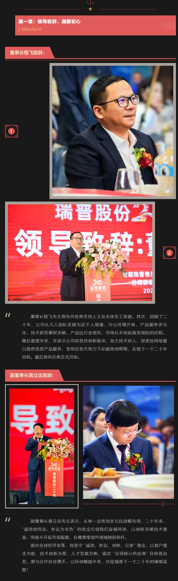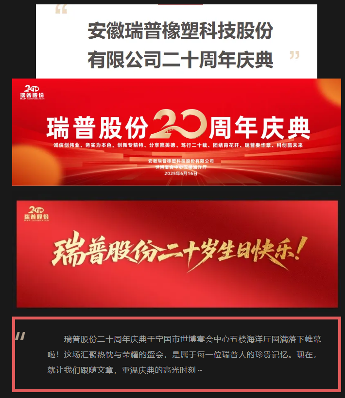 二十載櫛風(fēng)沐雨,二十載砥礪前行。值此安徽瑞普橡塑科技股份有限公司成立二十周年之際,我們滿懷感恩與喜悅,誠(chéng)邀您撥冗出席二十周年慶典活動(dòng),共同見(jiàn)證這一榮耀時(shí)刻,共敘情誼,共謀未來(lái)!